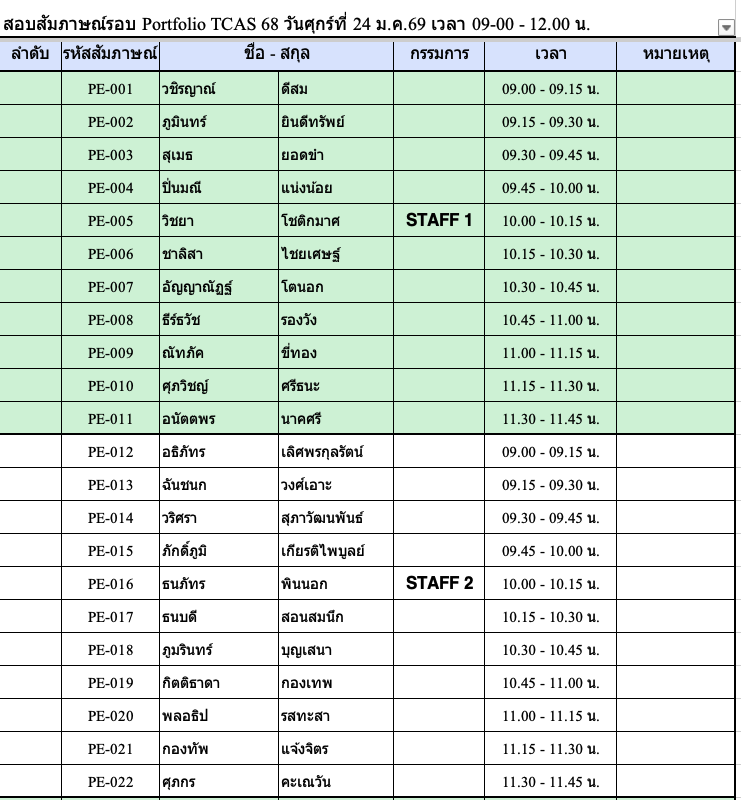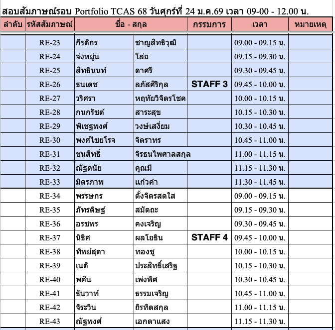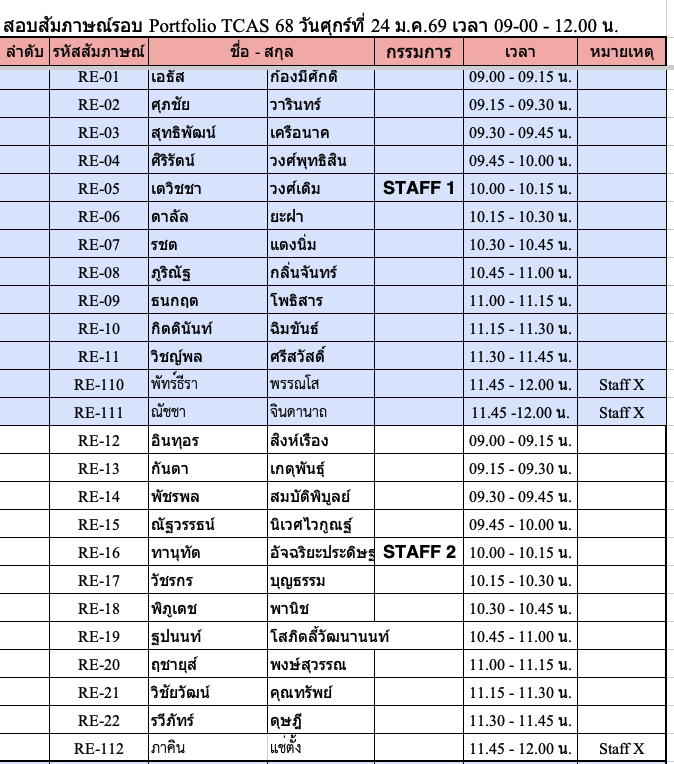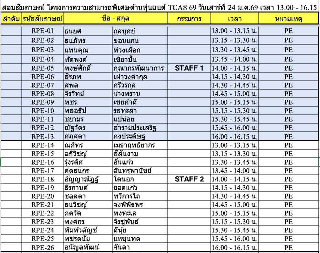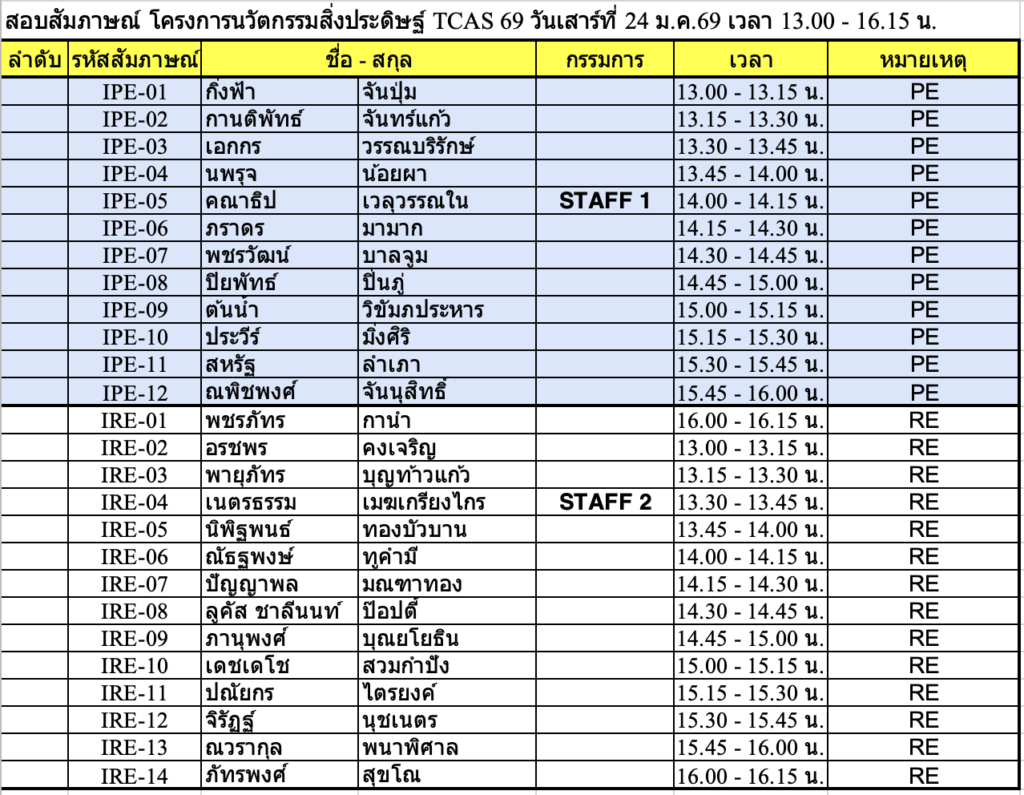 TCAS 69 ปีการศึกษา 2569 รอบ Portfolio สัมภาษณ์วันเสาร์ที่ 24 มกราคม 2569 !!!!สถานที่ ชั้น 1 ,3 และชั้น 4 อาคาร 82. คณะวิศวกรรมศาสตร์สถานที่สัมภาษณ์รอบ PortfolioPE บริเวณชั้น 1 อาคาร 82 คณะวิศวกรรมศาตร์RE ชั้น 4 ห้อง 401 คอมพิวเตอร์ของภาควิชาฯ รอบเช้า เริ่มลงทะเบียนประมาณ 8:30 น. รอบบ่าย เริ่มลงทะเบียน 12:30 น. (* ข้อแนะนำ เนื่องจากรอบเช้ามีจำนวนนักเรียนมาสอบจำนวนมาก การจารจรหน้ามหาวิทยาลัยติดขัดจึงขอนักเรียนที่สอบรอบบ่าย ให้วางแผนเดินทางมาช่วยสาย ๆ )โครงการส่งเสริมนวัตกร / บุตรบุคลากร-ศิษย์เก่า (สัมภาษณ์รอบเช้า) ลงทะเบียน 8:45 – 9:00 ชั้น 3 ศูนย์เรียนรู้ฯ อาคาร 82** โครงการสิ่งประดิษฐ์ และ ความสามารถพิเศษด้านหุ่นยนต์ (สัมภาษณ์รอบบ่าย)ลงทะเบียน 12:30 น. ชั้น 4 อาคาร 82 ห้องคอมพิวเตอร์ภาควิชา ลักษณะการสัมภาษณ์สาขา PE เป็นหลักสูตรเสริมทักษะภาษาอังกฤษ ให้แนะนำตัวภาษาอังกฤษ แล้วสัมภาษณ์ทั่วไปเป็นภาษาไทย แต่ถ้าสัมภาษณ์เป็นภาษาอังกฤษได้ จะพิจารณาเป็นพิเศษสาขา RE เป็นหลักสูตร English Program จะทำการสัมภาษณ์เป็นภาษาอังกฤษเท่านั้น !!! เอกสารที่นำมาส่งวันสัมภาษณ์ -สำเนาบัตรประชาชน-สำเนาแสดงผลการศึกษา 5 ภาคการศึกษา (ให้เซ็นรับรองสำเนาให้เรียบร้อย)-นำ Portfolio มาแสดงต่อกรรมการ และนำเสนอผลงานชิ้นที่ดีที่สุด (master piece) ขั้นตอนการเข้าสอบสัมภาษณ์ TCAS 69 ทั้งหลักสูตรวิศวกรรมการผลิต PE และวิศวกรรมหุ่นยนต์ฯ RE 1. เข้าร่วมกลุ่มไลน์เพื่อสอบถาม ใช้ในการตรวจสอบ ติดต่อ รับข่าวสาร ในวันสอบสัมภาษณ์ โดยสแกน QR code ด้านล่าง (งดถามที่ Facebook Messenger เพราะอาจจะไม่มีคนตอบคำถาม) กรุณาตรวจสอบรอบของตนเองให้ถูกต้องก่อนเข้ากลุ่ม โครงการ 20 Portfolio (สัมภาษณ์รอบเช้า) ทั้ง PE และ RE หลักสูตรวิศวกรรมการผลิต (PE) หลักสูตรวิศวกรรมหุ่นยนต์และระบบอัตโนมัติ (RE) โครงการ 60 นวัตกรรมสิ่งประดิษฐ์ / 61 ความสามารถด้านหุ่นยนต์ 43 เสริมสร้างนวัตกร /44 บุตรบุคลกรศิษย์เก่า ทั้ง สาขา PE และ RE ทั้งหลักสูตรวิศวกรรมการผลิต (PE) และ วิศวกรรมหุ่นยนต์ (RE) 2. รหัสลำดับการสัมภาษณ์ตาราง/เวลาสอบให้ตรวจสอบจากตารางด้านล่าง ****โดยจะแบ่งกลุ่มสอบกับอาจารย์ 1 ท่าน มีทั้งรอบเช้า และรอบบ่าย เนื่องจากมีจำนวนนักเรียนที่สมัครจำนวนมากรอบเช้า จะเริ่มสอบเวลา 9:00 น. รอบบ่าย จะเริ่มสอบ 13.00 น. ทุกกลุ่มสัมภาษณ์คนละประมาณ 15-20 นาที ให้นำพอร์ตมาแสดงต่อกรรมการสอบ* อาจจะมีการเลื่อนอันดับหาคนก่อนหน้าสละสิทธิ์ไม่มาสอบ !!!!!! ขอสงวนสิทธิ์ให้นักเรียนที่มาสอบ Onsite ณ ที่ มจพ. เท่านั้น !!!!!!หากติดภาระกิจอื่นๆ เช่น เข้าค่าย รด. หรือ เป็นตัวแทนโรงเรียนแข่งขันรายการต่างๆ-ให้นักเรียนนำหนังสือราชการที่ออกโดยโรงเรียนที่กำลังศึกษาอยู่ ว่ามี