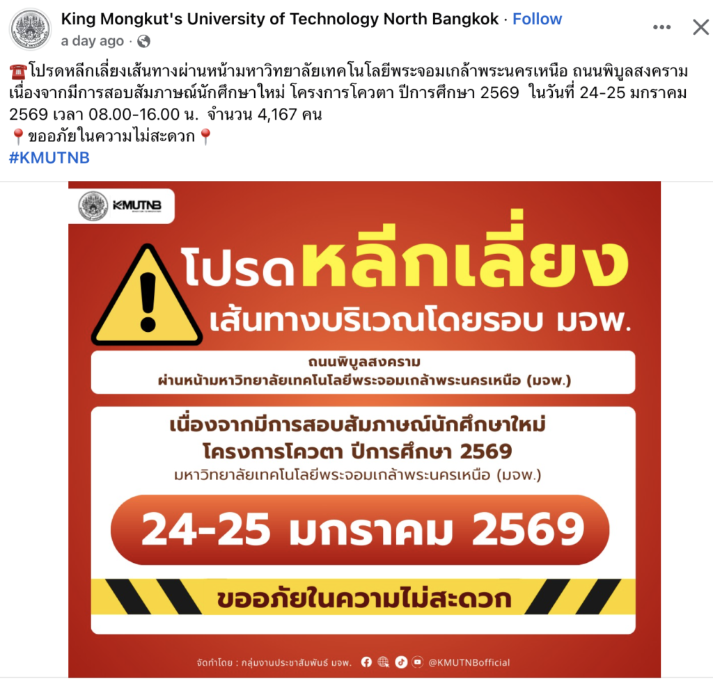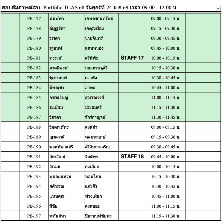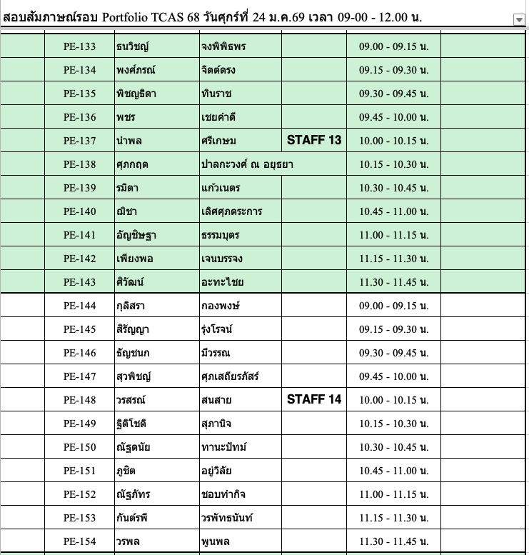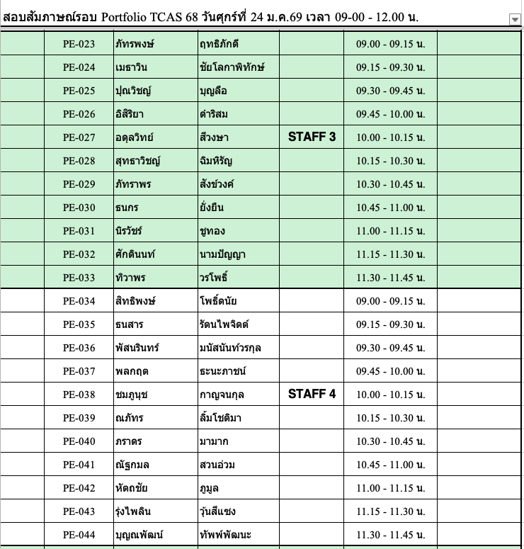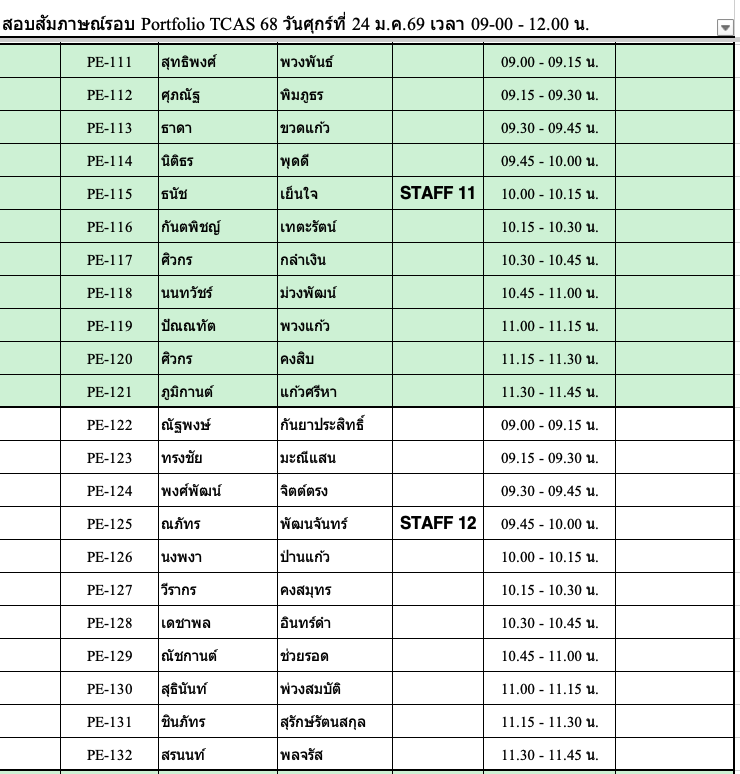 TCAS 69 ปีการศึกษา 2569 รอบ Portfolio สัมภาษณ์วันเสาร์ที่ 24 มกราคม 2569 !!!!สถานที่ ชั้น 1 ,3 และชั้น 4 อาคาร 82. คณะวิศวกรรมศาสตร์สถานที่สัมภาษณ์รอบ PortfolioPE บริเวณชั้น 1 อาคาร 82 คณะวิศวกรรมศาตร์RE ชั้น 4 ห้อง 401 คอมพิวเตอร์ของภาควิชาฯ รอบเช้า เริ่มลงทะเบียนประมาณ 8:30 น. รอบบ่าย เริ่มลงทะเบียน 12:30 น. (* ข้อแนะนำ เนื่องจากรอบเช้ามีจำนวนนักเรียนมาสอบจำนวนมาก การจารจรหน้ามหาวิทยาลัยติดขัดจึงขอนักเรียนที่สอบรอบบ่าย ให้วางแผนเดินทางมาช่วยสาย ๆ )โครงการส่งเสริมนวัตกร / บุตรบุคลากร-ศิษย์เก่า (สัมภาษณ์รอบเช้า) ลงทะเบียน 8:45 – 9:00 ชั้น 3 ศูนย์เรียนรู้ฯ อาคาร 82** โครงการสิ่งประดิษฐ์ และ ความสามารถพิเศษด้านหุ่นยนต์ (สัมภาษณ์รอบบ่าย)ลงทะเบียน 12:30 น. ชั้น 4 อาคาร 82 ห้องคอมพิวเตอร์ภาควิชา ลักษณะการสัมภาษณ์สาขา PE เป็นหลักสูตรเสริมทักษะภาษาอังกฤษ ให้แนะนำตัวภาษาอังกฤษ แล้วสัมภาษณ์ทั่วไปเป็นภาษาไทย แต่ถ้าสัมภาษณ์เป็นภาษาอังกฤษได้ จะพิจารณาเป็นพิเศษสาขา RE เป็นหลักสูตร English Program จะทำการสัมภาษณ์เป็นภาษาอังกฤษเท่านั้น !!! เอกสารที่นำมาส่งวันสัมภาษณ์ -สำเนาบัตรประชาชน-สำเนาแสดงผลการศึกษา 5 ภาคการศึกษา (ให้เซ็นรับรองสำเนาให้เรียบร้อย)-นำ Portfolio มาแสดงต่อกรรมการ และนำเสนอผลงานชิ้นที่ดีที่สุด (master piece) ขั้นตอนการเข้าสอบสัมภาษณ์ TCAS 69 ทั้งหลักสูตรวิศวกรรมการผลิต PE และวิศวกรรมหุ่นยนต์ฯ RE 1. เข้าร่วมกลุ่มไลน์เพื่อสอบถาม ใช้ในการตรวจสอบ ติดต่อ รับข่าวสาร ในวันสอบสัมภาษณ์ โดยสแกน QR code ด้านล่าง (งดถามที่ Facebook Messenger เพราะอาจจะไม่มีคนตอบคำถาม) กรุณาตรวจสอบรอบของตนเองให้ถูกต้องก่อนเข้ากลุ่ม โครงการ 20 Portfolio (สัมภาษณ์รอบเช้า) ทั้ง PE และ RE หลักสูตรวิศวกรรมการผลิต (PE) หลักสูตรวิศวกรรมหุ่นยนต์และระบบอัตโนมัติ (RE) โครงการ 60 นวัตกรรมสิ่งประดิษฐ์ / 61 ความสามารถด้านหุ่นยนต์ 43 เสริมสร้างนวัตกร /44 บุตรบุคลกรศิษย์เก่า ทั้ง สาขา PE และ RE ทั้งหลักสูตรวิศวกรรมการผลิต (PE) และ วิศวกรรมหุ่นยนต์ (RE) 2. รหัสลำดับการสัมภาษณ์ตาราง/เวลาสอบให้ตรวจสอบจากตารางด้านล่าง ****โดยจะแบ่งกลุ่มสอบกับอาจารย์ 1 ท่าน มีทั้งรอบเช้า และรอบบ่าย เนื่องจากมีจำนวนนักเรียนที่สมัครจำนวนมากรอบเช้า จะเริ่มสอบเวลา 9:00 น. รอบบ่าย จะเริ่มสอบ 13.00 น. ทุกกลุ่มสัมภาษณ์คนละประมาณ 15-20 นาที ให้นำพอร์ตมาแสดงต่อกรรมการสอบ* อาจจะมีการเลื่อนอันดับหาคนก่อนหน้าสละสิทธิ์ไม่มาสอบ !!!!!! ขอสงวนสิทธิ์ให้นักเรียนที่มาสอบ Onsite ณ ที่ มจพ. เท่านั้น !!!!!!หากติดภาระกิจอื่นๆ เช่น เข้าค่าย รด. หรือ เป็นตัวแทนโรงเรียนแข่งขันรายการต่างๆ-ให้นักเรียนนำหนังสือราชการที่ออกโดยโรงเรียนที่กำลังศึกษาอยู่ ว่ามี